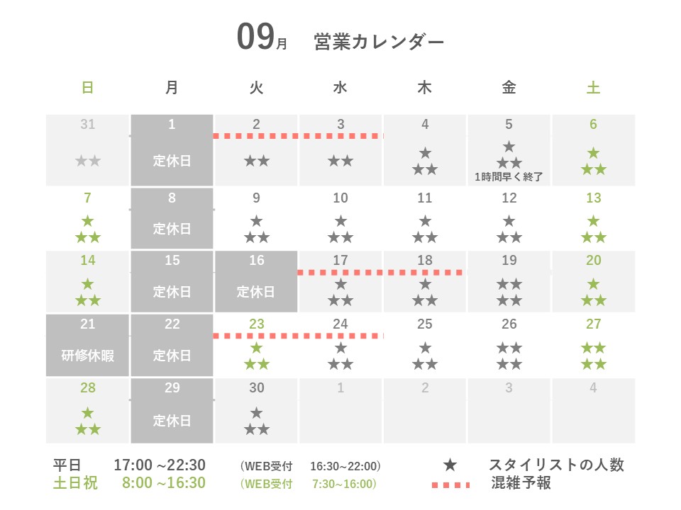 営業カレンダーのスタイリスト数は随時更新しておりますので、ご来店前のご確認をおススメ致します。