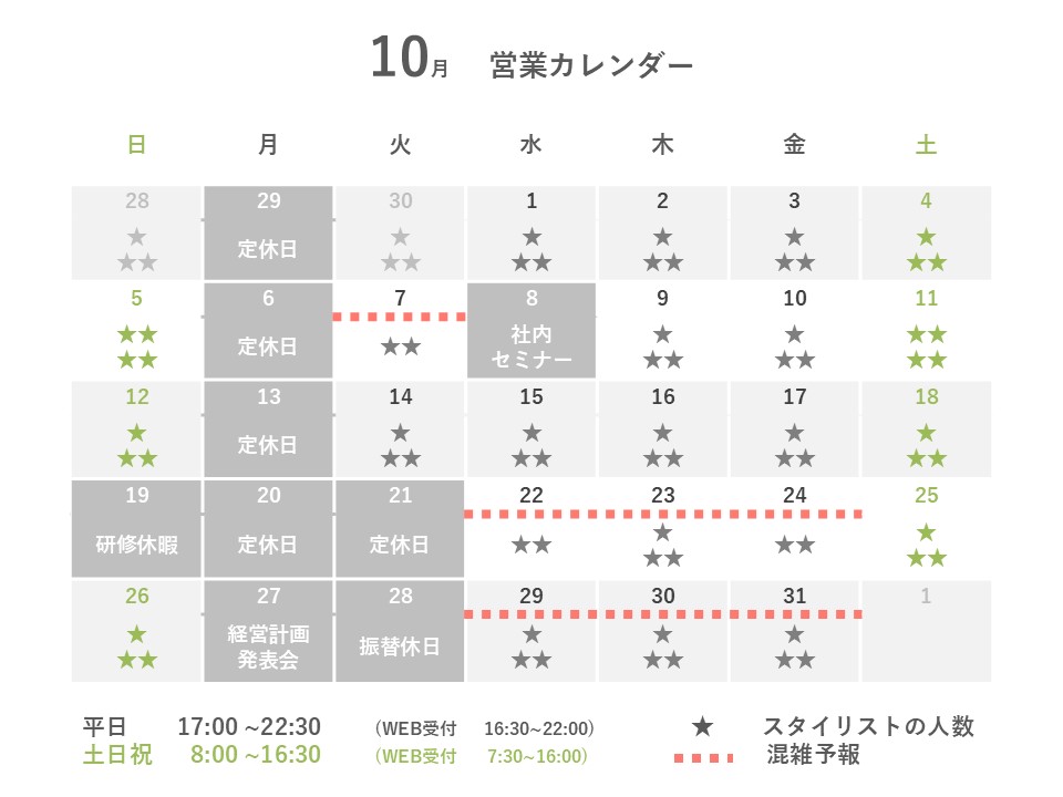 営業カレンダーのスタイリスト数は随時更新しておりますので、ご来店前のご確認をおススメ致します。