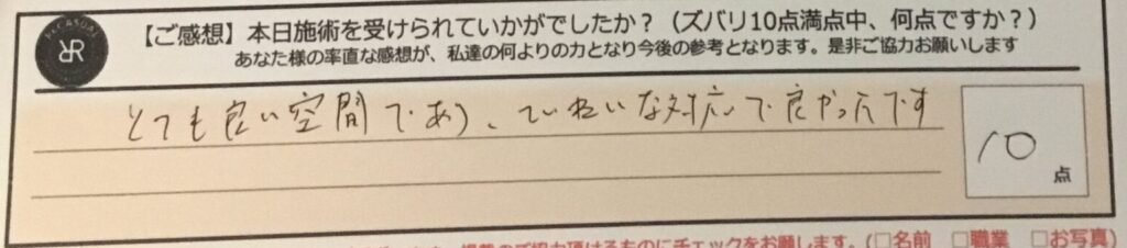 お客様の声「とても良い空間であり、ていねいな対応で良かったです。」ズバリ10点!!