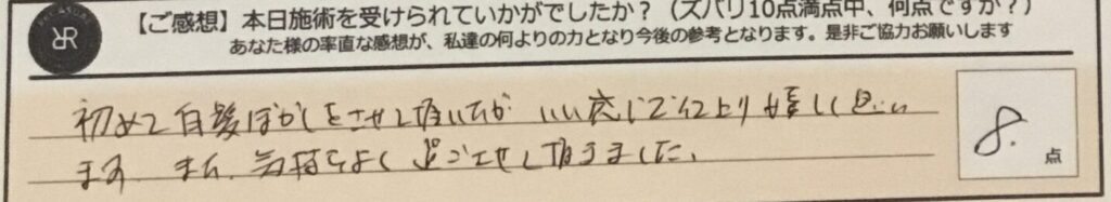 初めて白髪ぼかしをさせて頂いたが、いい感じで仕上がり嬉しく思います。また、気持ちよく過ごさせていただきました。ズバリ8点‼