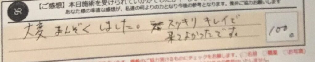 お客様の声「大変まんぞくしました。スッキリキレイで来てよかったです。」ズバリ100点!!