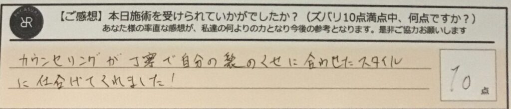 カウンセリングが丁寧で自分の髪のクセに合わせたスタイルに仕上げてくれました!ズバリ10点!!