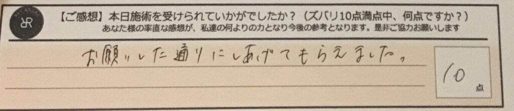お客様の声「お願いしたとおりに仕上げてもらえました。」ズバリ10点!!