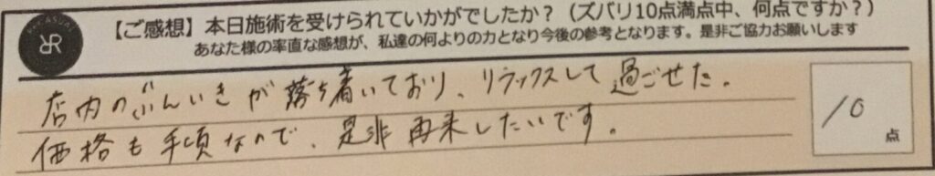 店内のふんいきが落ち着いており、リラックスして過ごせた。価格も手頃なので是非再来したいです。ズバリ10点!!