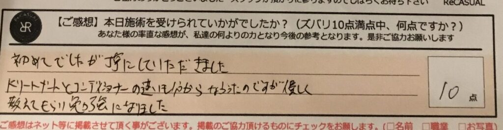 初めてでしたが丁寧にして頂きました。トリートメントとコンディショナーの違いも分からなかったのですが優しく教えてもらい勉強になりました。ズバリ10点!!
