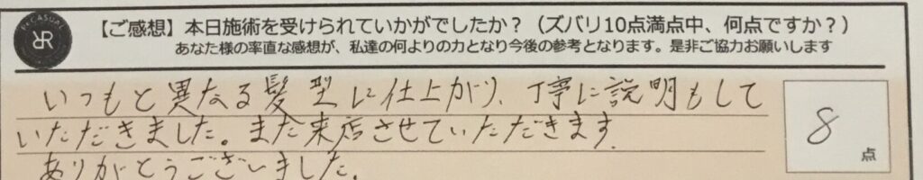 いつもと異なる髪型に仕上がり、丁寧に説明もしていただきました。また来店させていただきます。ありがとうございました。ズバリ8点!