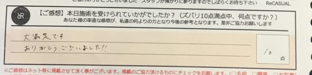 お客様の声「丁寧なカウンセリングで安心して施術を任せられました。」ズバリ10点!!