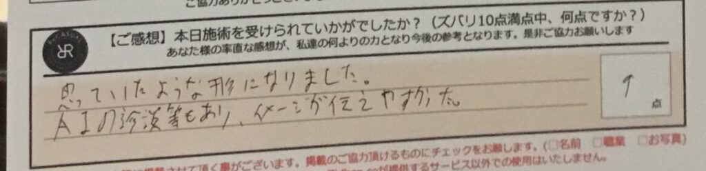 思っていたような形になりました。AIの診断等もあり、イメージが伝えやすかった。ズバリ9点!!30代、K・I様