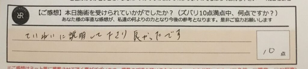 お客様の声「ていねいに説明して下さり良かったです。」ズバリ10点!!