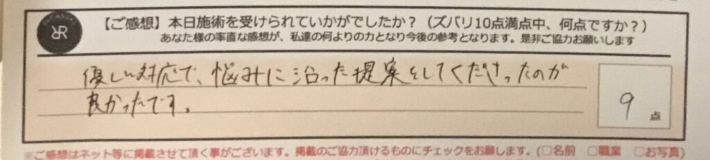 お客様の声「優しい対応で、悩みに沿った提案をしてくださったのが良かったです。」ズバリ9点!!