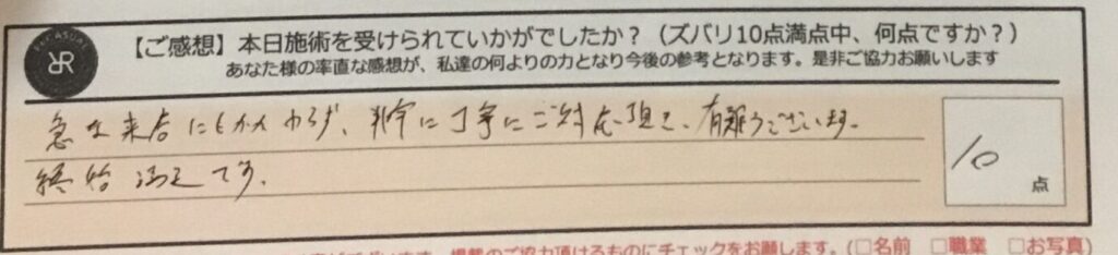 お客様の声「急な来店にもかかわらず、非常に丁寧にご対応頂き、有難うございます。終始満足です。」ズバリ10点!!
