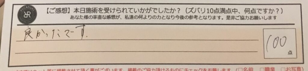 お客様の声「接客がとても心地良かったです」ズバリ10点!!