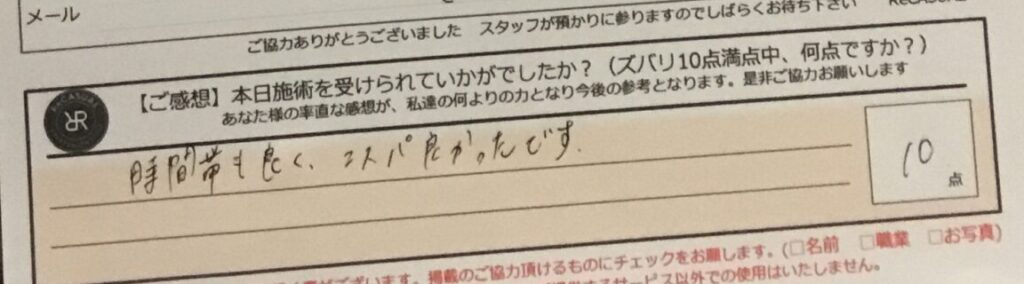 お客様の声「時間帯も良く、コスパ良かったです。」ズバリ10点!!