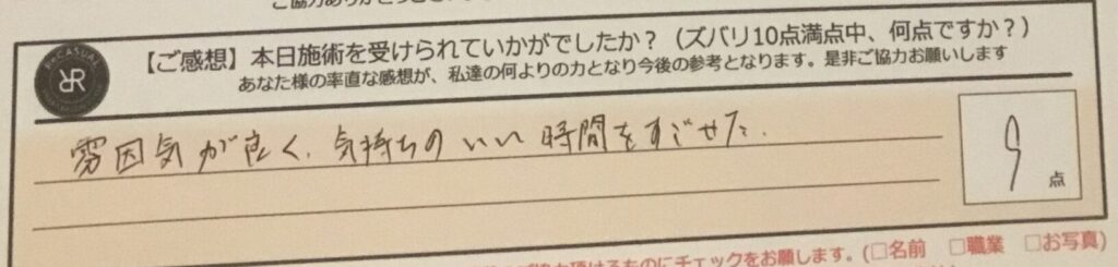 「雰囲気が良く、気持ちのいい時間をすごせた。」ズバリ9点!!