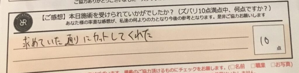 お客様の声「求めていた通りにカットしてくれた。」ズバリ10点!!