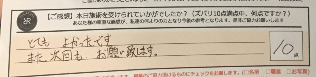 お客様の声「とても、よかったです。また次回も、お願い致します。」ズバリ10点!!